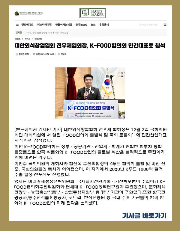 한국목재신문전우제 대표쉐프 대한외식창업아카데미 경기도소상공인"삼천스" 창업컨설팅 자문